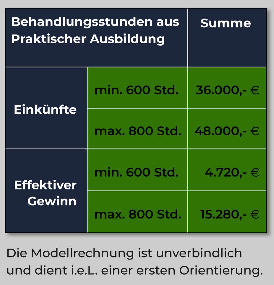 Bei den geforderten mindestens 600 Behandlungsstunden entstehen bei der unten stehenden Modellrechnung über die Gesamtzeit der Ausbildung Einnahmen von voraussichtlich 36.000,- €. Diese Modellrechnung geht von einer Honorierung von 60,- € pro geleisteter und bewilligter Behandlungsstunde aus, die das Ausbildungsinstitut an den Ausbildungsteilnehmer auszahlt. Nicht berücksichtigt dabei sind Leistungen der Probatorik (4 probatorische Sitzungen, Anamnese und vertiefte Exploration) und der Durchführung testdiagnostischer Verfahren sowie die Zuschläge für die Kurzzeittherapie, die die Vergütung erhöhen. Ebenfalls unberücksichtigt sind die Einnahmen durch die Praktische Tätigkeit 1 und die Praktische Tätigkeit 2 (insgesamt 1.800 Stunden), die in kooperierenden Kliniken absolviert wird.